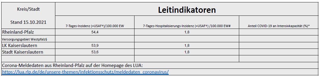Die Leitindikatoren-Werte für die zurückliegenden Werktage finden Sie zusammen mit weiteren Corona-Meldedaten aus Rheinland-Pfalz auf der Homepage des LUA.