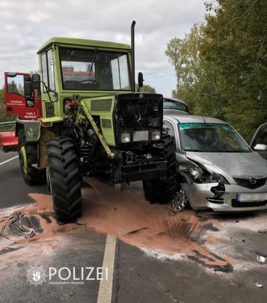 Auf der B48 zwischen Enkenbach-Alsenborn und Fischbach ist es am Donnerstagnachmittag zu einem Unfall gekommen. Kurz nach dem Kreisverkehr wollte ein Traktor nach links in einen Wirtschaftsweg einbiegen. Ein von hinten herannahender Pkw wollte den Traktor überholen. Die beiden Fahrzeuge kollidierten. Beide Fahrzeuge waren nicht mehr fahrbereit und mussten abgeschleppt werden. Der Fahrer des Traktors verletzte sich leicht. |elz