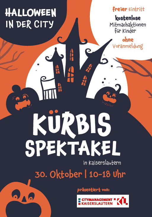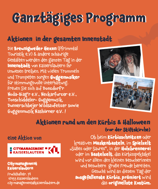 Mit einem ganztägigen Programm und Aktionen in der gesamten Innenstadt lädt das Citymanagement Kaiserslautern am 30. Oktober in die Innenstadt ein. Die „Breunigweiler Hexen“ vom Pfrimmtal Touristik e.V. und andere schaurige Gestalten werden den ganzen Tag in der Fußgängerzone von Kaiserslautern ihr Unwesen treiben. Mit vielen Trommeln und Trompeten sorgen „Guggemusiker“, wie der Donzdorf’r Noda-Biag’r e.V., der Neckarfurzer e.V., die Tonschiddeler-Guggemusik, die Dunnerschbejer Wildsaufetzer sowie der Guggenmusik Nashörner e.V., für stimmungsvolle Unterhaltung. Das große Highlight findet an diesem Tag vor der Stiftskirche statt: Hier sind Aktionen rund um den Kürbis und Halloween geplant. Ob beim Kürbisschnitzen oder kreativen Maskenbasteln, das Kürbisspektakel wird vor allem den kleinen Besucherinnen und Besuchern große Freude bereiten. Gesucht wird an diesem Tag der ausgefallenste Kürbis, zudem wird das originellste Kostüm prämiert. Kostenlos und ohne Voranmeldung können Kinder von 10.00 bis 18.00 Uhr in den schaurig gestalteten Spielzelten ihrer Kreativität freien Lauf lassen.
