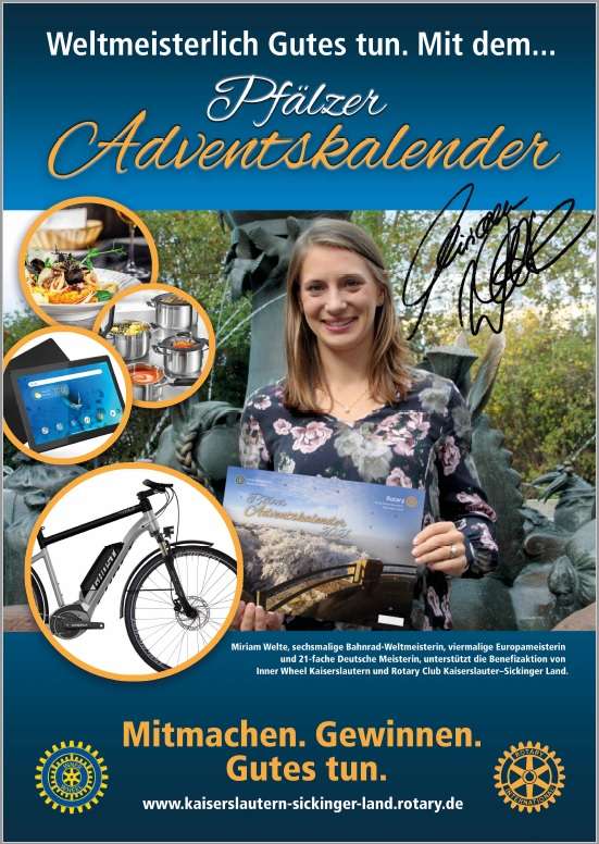 Rotary Kaiserslauter-Sickingerland und Innerwheel Kaiserslautern veranstalten diese Jahr zum dritten mal Ihre Adventskalender Aktion. Jeder Kalender kostet 5.- € und nimmt als Los an der Verlosung teil. Am 06.11.2021 und am 13.11.2021 werden die Kalender auf dem Wochenmarkt in Kaiserslautern vor dem 11a in der Zeit von 9:00 Uhr bis 13:00 Uhr verkauft. der Erlös kommen Lichtblick 2000 e.V., Kinderschutzbund Kaiserslautern-Kusel e.V. , Mehrgenerationenhaus Ramstein-Miesenbach, Elterniniviative krebskranker Kinder und weiteren Projekte der Kinder- und Jugendarbeit in der Region Kaiserslautern zugute. Weitere Vorverkaufsstellen in Sanitätshaus ANK in der Königstraße 127 und der Pirmasenser Straße 7-9.