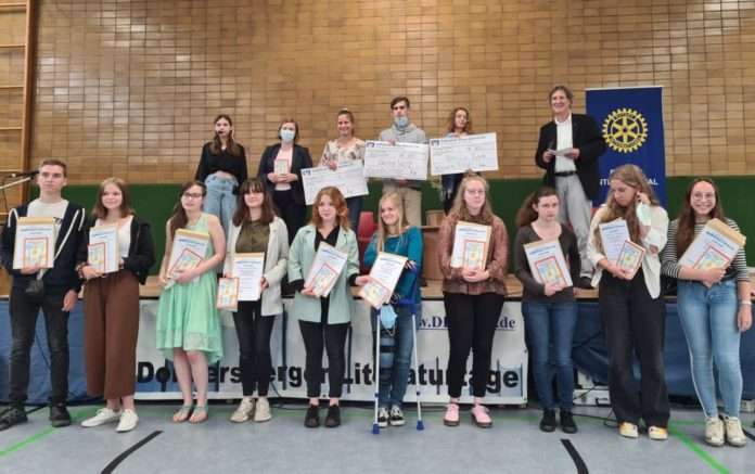 Bu: Preisverleihung mit der rheinland-pfälzischen Kulturministerin Katharina Binz (hintere Reihe, Zweite von links) und dem Organisator Thomas M. Mayr (hintere Reihe rechts): Gewinnerinnen des Wettbewerbs der Donnersberger Literaturtage