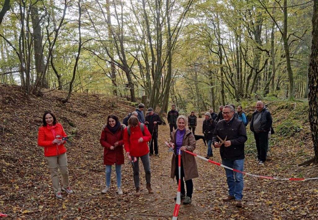 Freuten sich, den Sternwandelweg zu eröffnen (v. l. n. r.): Die Bürgermeisterin der Verbandsgemeinde Pirmasens-Land, Silvia Seebach, die Sternenpark-Projektkoordinatorinnen Lea Grünling und Sarah Köngeter vom Biosphärenreservat Pfälzerwald, die Landrätin des Kreises Südwestpfalz, Dr. Susanne Ganster, sowie Martin Niebuhr, Ortsbürgermeister von Lemberg (Foto: Biosphärenreservat/frei zur Verwendung durch die Presse)