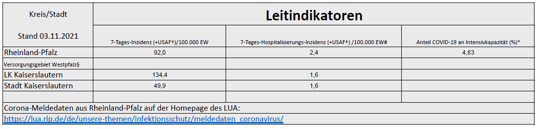 Coronavirus SARS-CoV-2: Fallzahlen und Leitindikatoren für Rheinland-Pfalz, (Datenstand vom 03.11.2021, 14:10 Uhr)