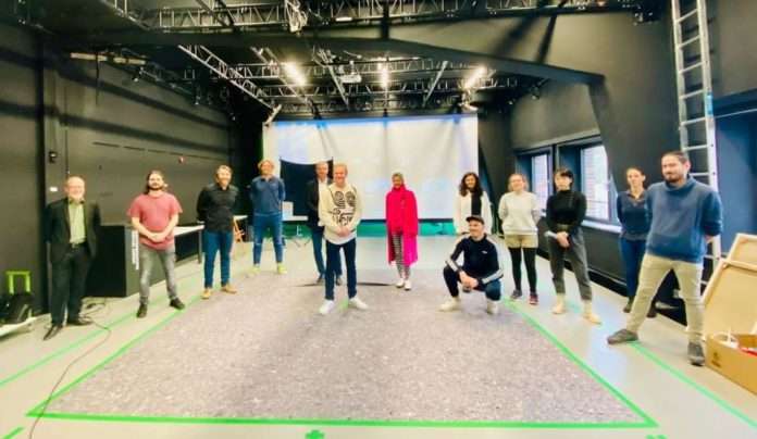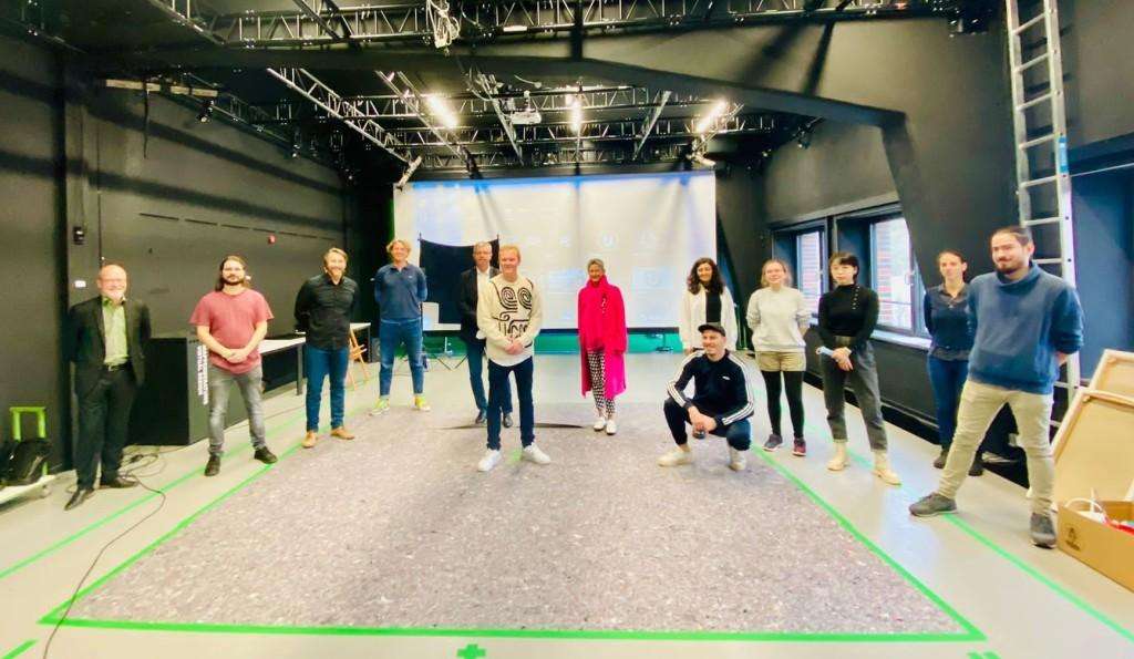 Bild: Leon Löwentraut (vorne Mitte) umrahmt von Bürgermeisterin Beate Kimmel und Hochschulpräsident Hans-Joachim Schmidt sowie Studierenden und Professoren des Studiengangs Virtual Design (Foto: HS KL)