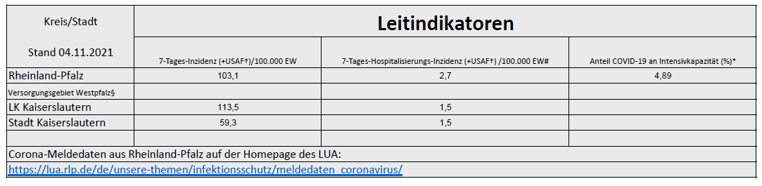 Coronavirus SARS-CoV-2: Fallzahlen und Leitindikatoren für Rheinland-Pfalz, (Datenstand vom 04.11.2021, 14:10 Uhr)