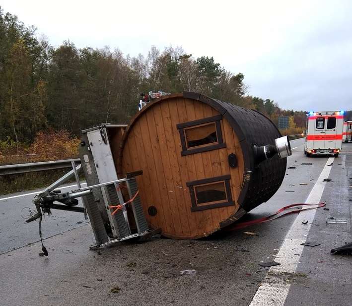 A 62, Ramstein-Miesenbach – Am Sonntag gegen 12 Uhr befuhr ein 27 jähriger Fahrzeugführer die Autobahn 62 von Pirmasens in Richtung Trier. Kurz nach dem Autobahnkreuz Landstuhl wollte er ein Fahrzeug mit Anhänger, welches eine sogenannte Fasssauna geladen hatte, überholen. Hierbei übersah der Fahrzeugführer ein weiteres Fahrzeug, welches bereits zum Überholen angesetzt hatte. Beim Ausscheren kollidierten die beiden Fahrzeuge, wobei eines der Fahrzeuge zusätzlich auf das Gespann gelenkt wurde. Der Anhänger stürzte daraufhin um, die Sauna blieb auf der Fahrbahn liegen. Durch den Unfall wurden die vier Fahrzeuginsassen zum Glück nur leicht verletzt. Die Autobahn musste wegen der Bergungsarbeiten für etwa eineinhalb Stunden gesperrt werden. Die Polizei schätzt den entstandenen Sachschaden auf 42.000 Euro.