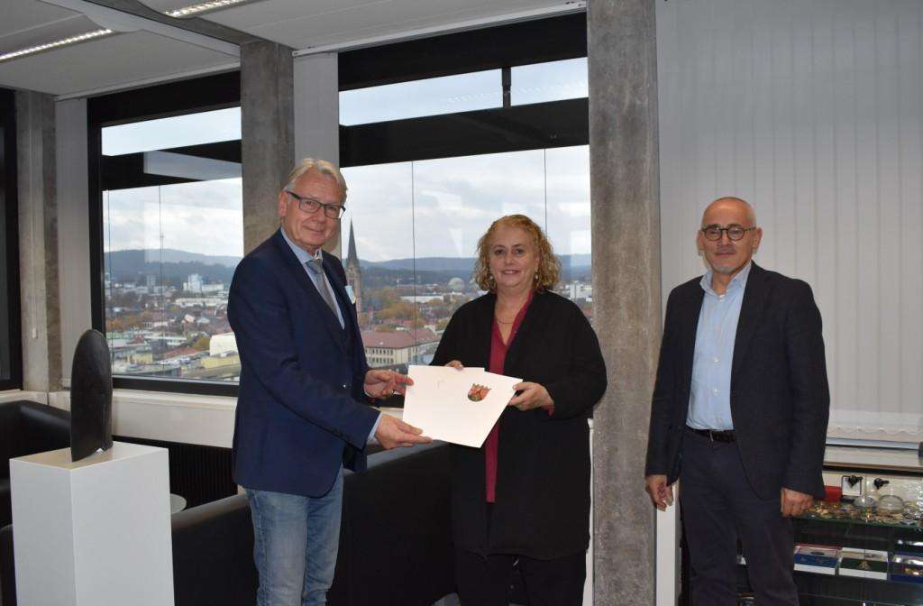 „Ein solch langes Engagement im Dienste ein- und desselben Arbeitsgebers ist heutzutage keine Selbstverständlichkeit mehr“, betonte Weichel in seiner Ansprache. Die Sozialpädagogin ist seit 17 Jahren die Leiterin der Gemeinsamen Adoptionsvermittlungsstelle und erzählte in der kleinen Feierstunde von einigen Erlebnissen der vergangenen Jahrzehnte. „Dienstjubiläen sind immer sehr interessant, da die Kolleginnen und Kollegen unzählige Geschichten erzählen können. Bei Ihren merkt man dabei auch ganz besonders, dass sie mit Leib und Seele für Ihre Arbeit brennen. Daher danke ich Ihnen im Namen des gesamten Stadtvorstandes für die langjährige Treue und den Einsatz für die Stadtverwaltung“, so der OB weiter.