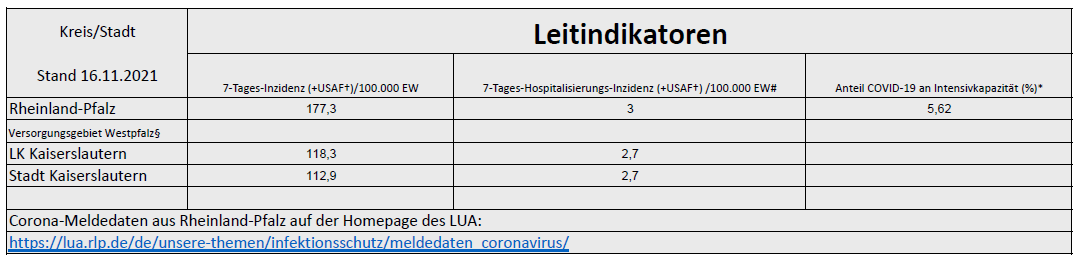 Coronavirus SARS-CoV-2: Fallzahlen und Leitindikatoren für Rheinland-Pfalz, (Datenstand vom 16.11.2021, 14:10 Uhr)