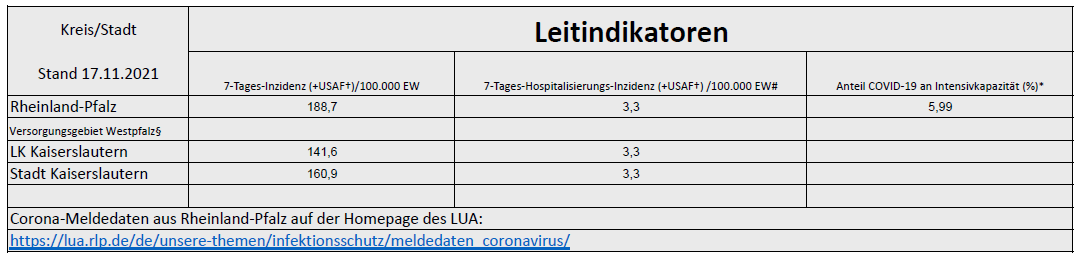 Coronavirus SARS-CoV-2: Fallzahlen und Leitindikatoren für Rheinland-Pfalz, (Datenstand vom 17.11.2021, 14:10 Uhr)