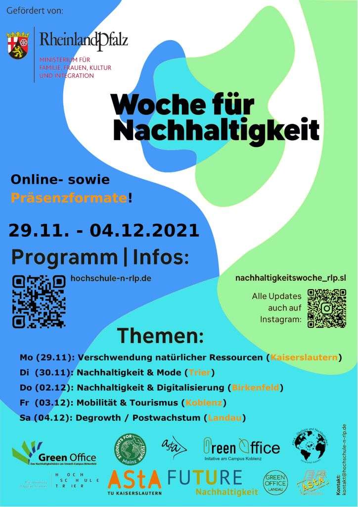 Vom 29.11.2021 bis zum 04.12.2021 laden unterschiedliche Nachhaltigkeitsinitiativen aus Hochschulen und Universitäten in Rheinland-Pfalz zur Nachhaltigkeitswoche ein! Wie bereits im vergangenen Jahr werden in dem Zeitraum vielfältige Veranstaltungen angeboten, die von den Studierenden der einzelnen Standorte organisiert und durchgeführt werden. Aus Kaiserslautern beteiligten sich die Hochschulgruppe FUTURE Nachhaltigkeit und das AStA Referat Nachhaltigkeit der TU Kaiserslautern an der gemeinsamen Planung.