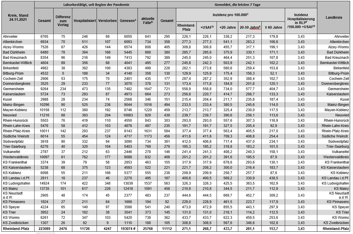 Coronavirus SARS-CoV-2: Fallzahlen für Rheinland-Pfalz, (Datenstand vom 24.11.2021, 14:10 Uhr)