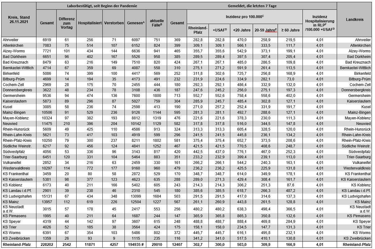 Coronavirus SARS-CoV-2: Fallzahlen für Rheinland-Pfalz, (Datenstand vom 26.11.2021, 14:10 Uhr)