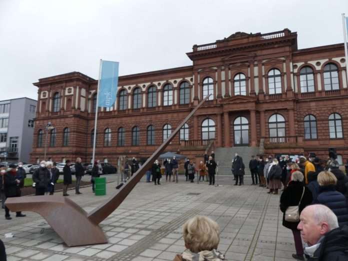 Zu Beginn umhüllte eine rote Plane das Werk und Michael Gärtner stimmte das Publikum mit einer Klangperformance mit Schlagwerk in die Matinee ein. „Wir feiern, dass es Franz Bernhards ‚Aufragende‘ gibt und dass sie einen wunderbaren Platz vor dem Museum Pfalzgalerie Kaiserslautern bekommen hat“, sagte Tanja Hermann, Kulturkoordinatorin des Bezirksverbands Pfalz, bei der Übergabe der Plastik. Dies sei der angemessene Ort für einen „Bernhard für die Pfalz“ und spielte damit auf die Bürgerinitiative an, die dies möglich gemacht habe. Viele hätten diese Aktion unterstützt: die Witwe Lucia Bernhard, die beiden Initiatoren Wolfgang Thomeczek und Manfred Geis, die vielen Künstlerinnen und Künstler, die Werke gespendet hätten, die Andreas C.H. Schell Stiftung, die Stiftung Rheinland-Pfalz für Kultur und der Freundeskreis des Museums sowie zahlreiche Pfälzerinnen und Pfälzer. Die „Aufragende“ habe eine positive Ausstrahlung und verbreite Zuversicht. Der rheinland-pfälzische Staatsminister Alexander Schweitzer überbrachte die Grüße der Landesregierung und der Kulturministerin Katharina Binz. Das Kunstwerk werde „von vielen Menschen in der Pfalz getragen“. Er könne sich „kaum einen besseren Standort inmitten der Pfalz“ vorstellen.