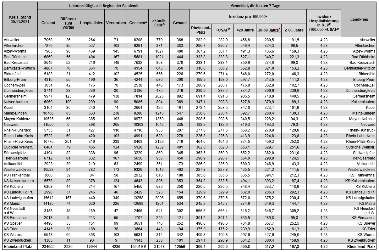 Coronavirus SARS-CoV-2: Fallzahlen für Rheinland-Pfalz, (Datenstand vom 30.11.2021, 14:10 Uhr)