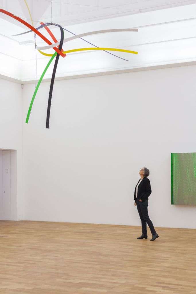 In der Sonderausstellung „Finale – Director’s Cut“ im Oberlichtsaal des mpk: Dr. Britta E. Buhlmann mit Lars Englunds Werk „Relative“ von 1998 und Ulrich Moskopps Gemälde „Farbkasten (grün)“ von 1990