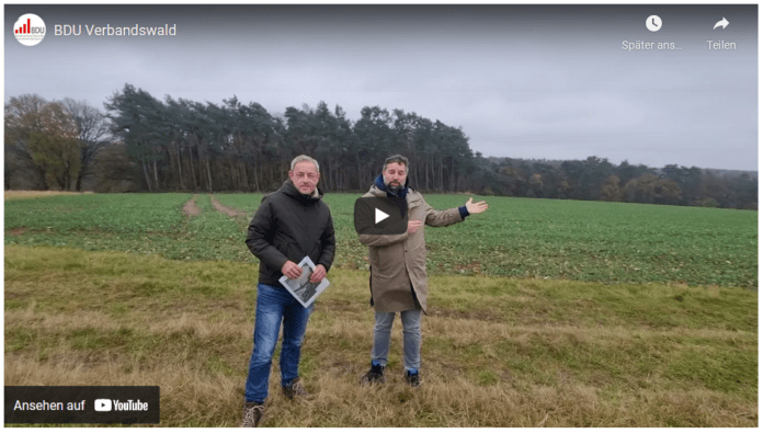 SDW- Bundesgeschäftsführer Christoph Rullmann: „Dieses Waldprojekt ist ein besonderes, da hier knapp vier Hektar neuer Wald geschaffen wird und sich die Waldfläche vergrößert. Aktuell finden die meisten SDW-Pflanzungen auf den 277.000 Hektar Kahlflächen statt. Die Waldzustandserhebung 2020 sowie die ersten Berichte aus 2021 zeigen: Die Wälder sind in einem besorgniserregenden Zustand – dem schlechtesten seit Beginn der regelmäßigen Erhebungen durch das BMEL vor 37 Jahren. Dabei erfüllt das Ökosystem Wald zahlreiche wichtige Funktionen. Die jährliche Kohlenstoffspeicherwirkung des Waldes beläuft sich aktuell auf 57 Millionen Tonnen CO2 und die der stofflich genutzten Holzprodukte auf. 4,2 Millionen Tonnen CO2. Er ist einer der wichtigsten Kohlenstoffsenken und Sauerstoffproduzenten. Wir brauchen gesunde und klimastabile Wälder und der BDU und seine Mitglieder tragen durch ihre Initiative #Verbandswald mit einem Puzzlestück dazu bei.