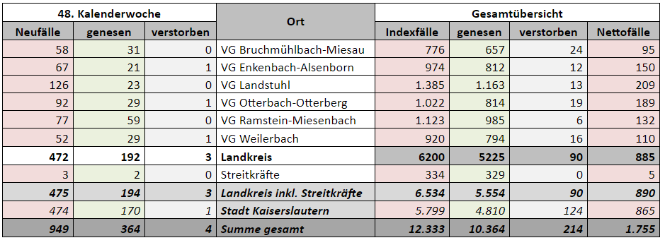 KL – Coronavirus Stadt/Kreis: 12.333 Indexfälle in Stadt und Landkreis, 10.364 genesenen Personen, 214 Todesfälle, KW 48.