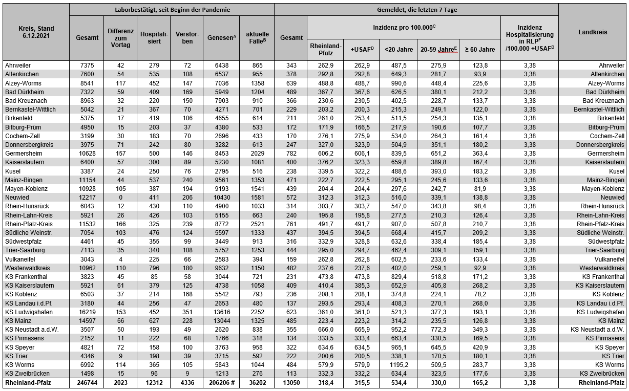 Coronavirus SARS-CoV-2: Fallzahlen für Rheinland-Pfalz, (Datenstand vom 06.12.2021, 14:10 Uhr)