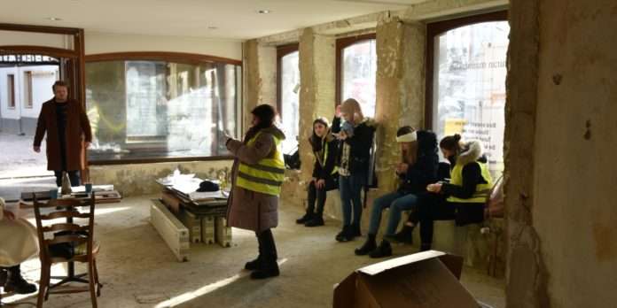 Bild 3) Studierende der Architektur skizzieren Grundrisse für die Maßeintragungen: Christoph Weber, Bao-Yen Luu, Nina Gross, Katharina Hannes (v.l.nr.) (Foto: privat)