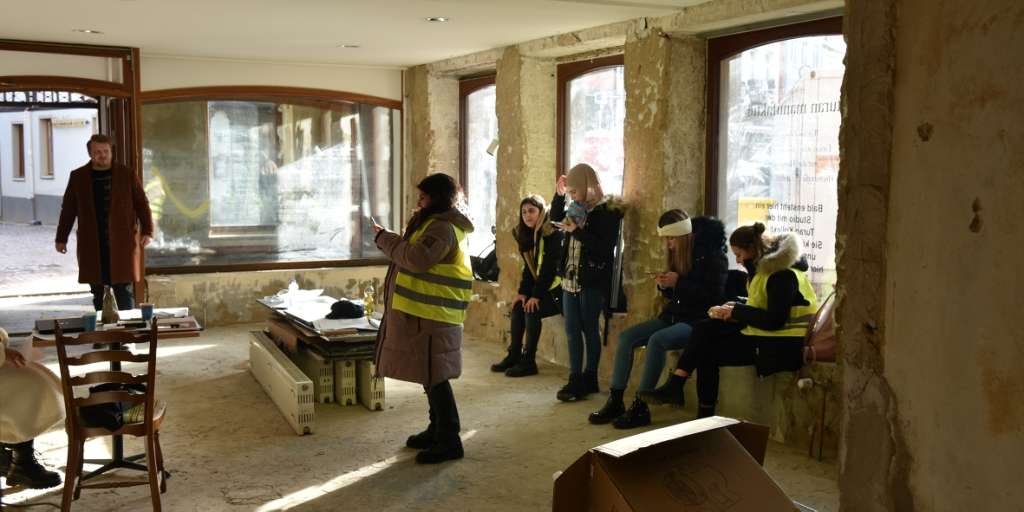 Bild 1) Morgendliche Besprechung: Studierende der Hochschule Kaiserslautern planen die Neuvermessung historischer Gebäude in Ahrweiler: Mert Sezai Cantürk, Naile Guel Sahin, Zelal Yamac, Süeda Oguz, Betül Sari, Dilara Salih (v.l.nr.) (Foto: privat)