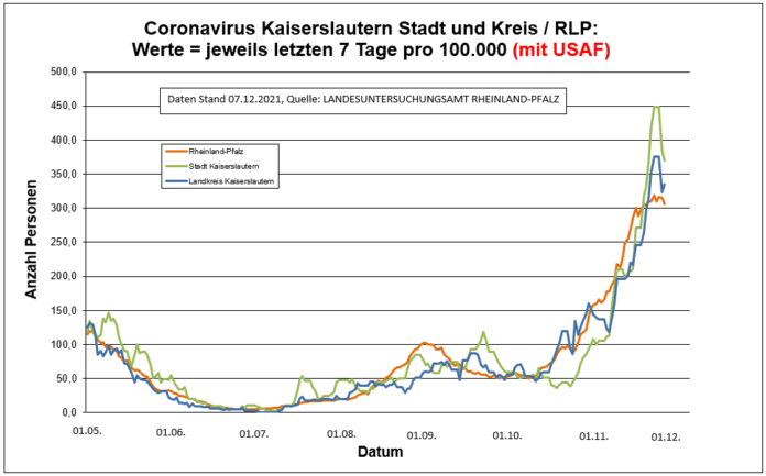 Coronavirus KL letzten 7 Tage pro 100.000 (mit USAF): Landkreis 335,5 ; Stadt 370,2 ; RLP 305,8