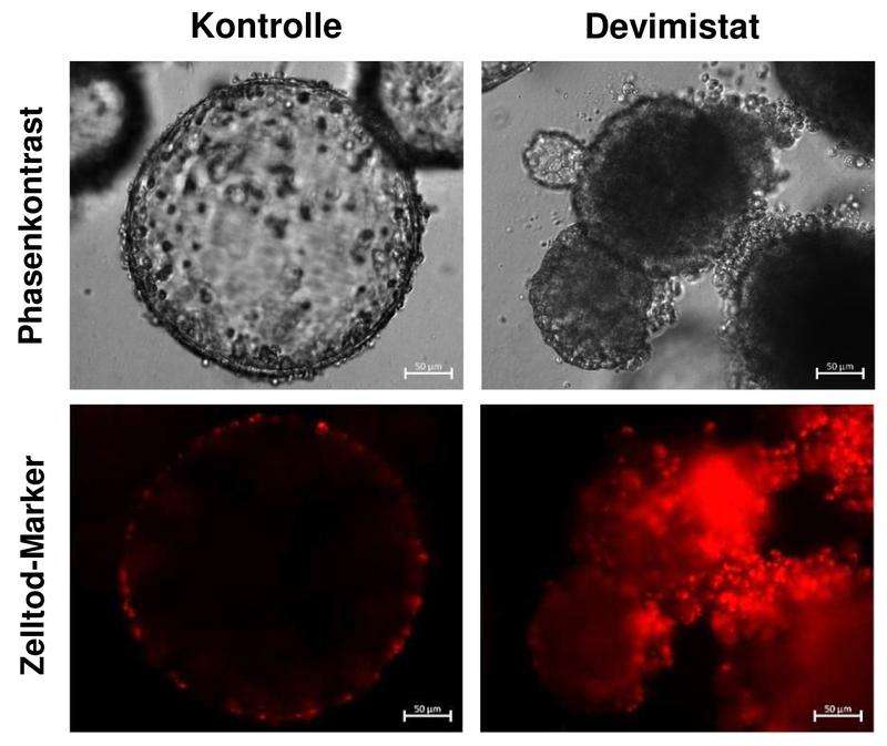 Darmtumor-Organoide nach Behandlung mit Devimistat (rechts) sowie ohne Behandlung (links). Dargestellt sind die Tumororganoide im Phasenkontrast und nach Färbung mit einem roten Zelltodmarker. © Jörg Fahrer, TU Kaiserslautern