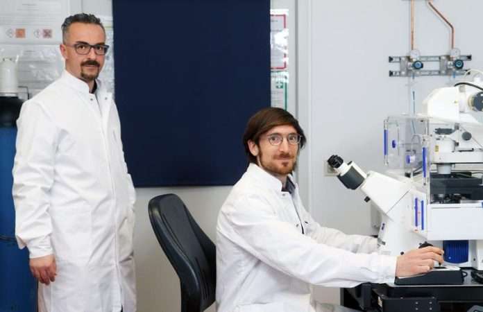 Prof. Dr. Jörg Fahrer (links) mit Philipp Demuth (rechts) am konfokalen Laser-Scanning-Mikroskop im Labor des Fachbereichs Chemie der TU Kaiserslautern. © Thomas Koziel/TU Kaiserslautern