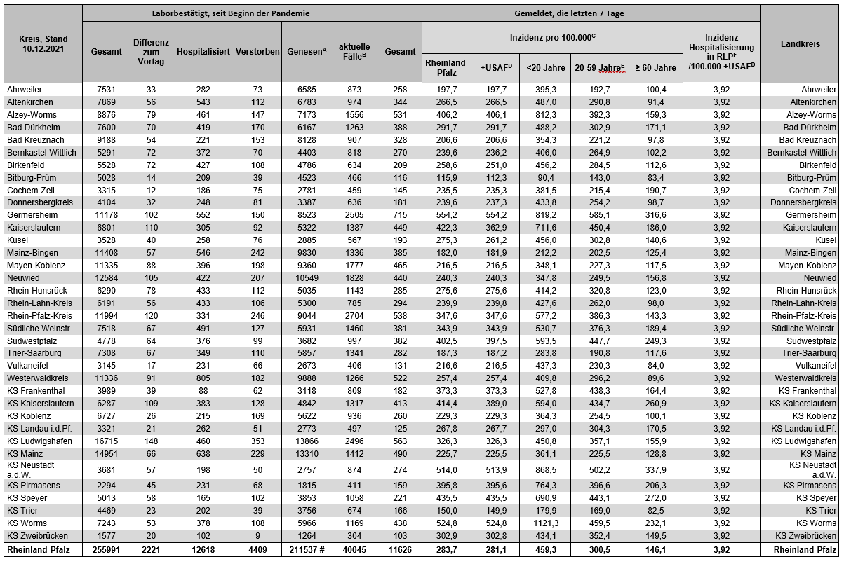 Coronavirus SARS-CoV-2: Fallzahlen für Rheinland-Pfalz, (Datenstand vom 10.12.2021, 14:10 Uhr)