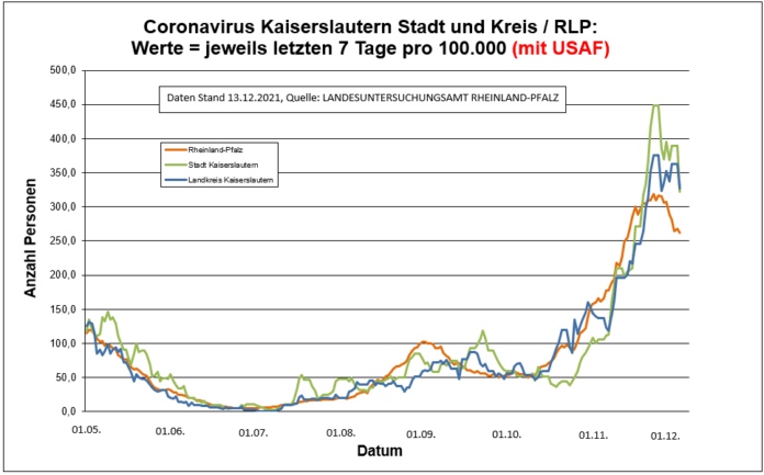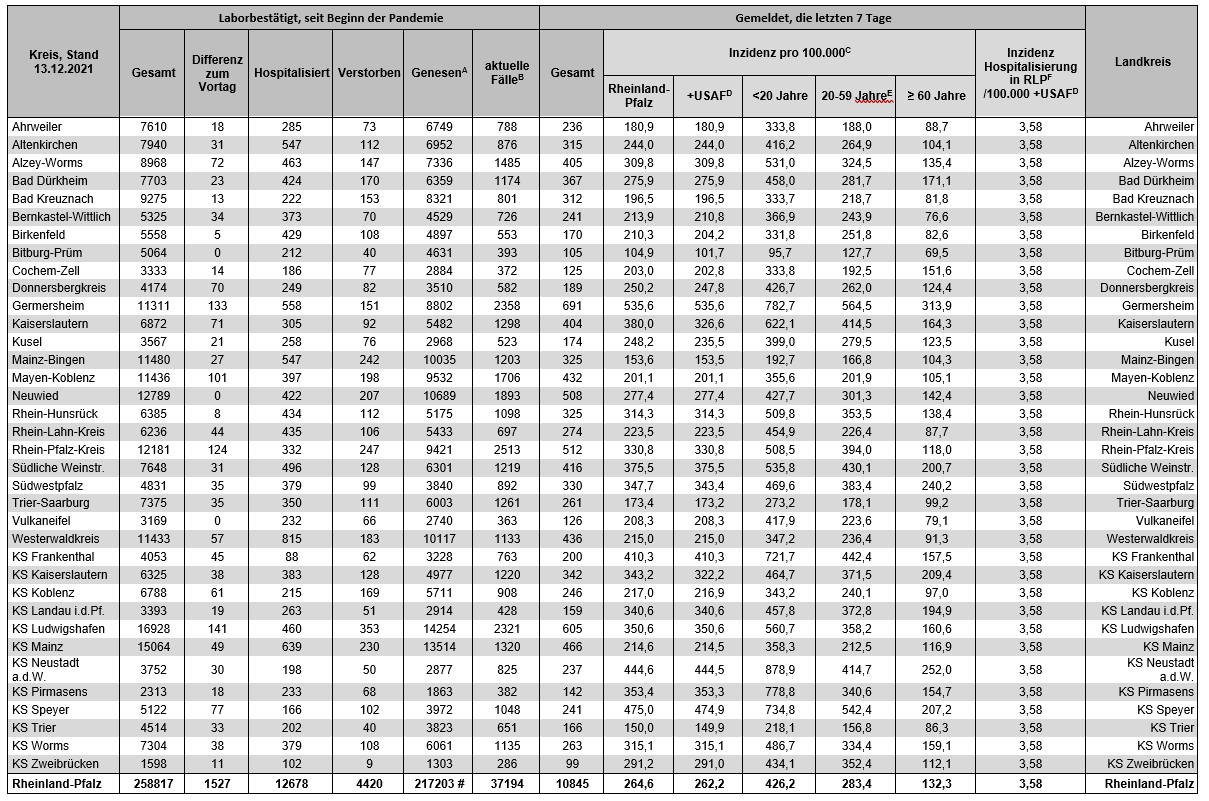 Coronavirus SARS-CoV-2: Fallzahlen für Rheinland-Pfalz, (Datenstand vom 13.12.2021, 14:10 Uhr)