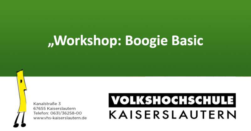 Am Freitag, dem 14.01.2022, findet von 19:00-21:00 Uhr bei der Volkshochschule Kaiserslautern ein Tanzworkshop „Workshop: Boogie Basic“ statt.