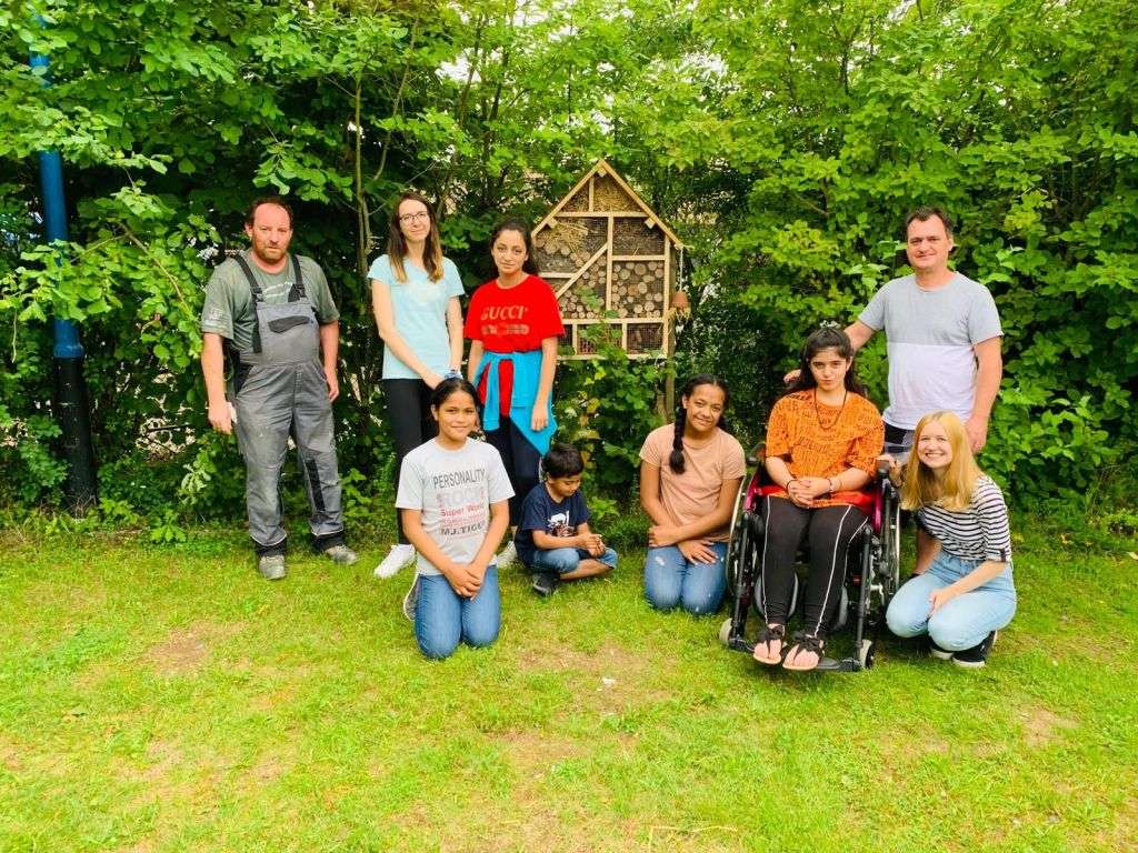Foto (1): Studentin Susanne (rechts außen) betreute den gemeinsamen Bau eines Insektenhotels (Quelle: Malteser Kaiserslautern)