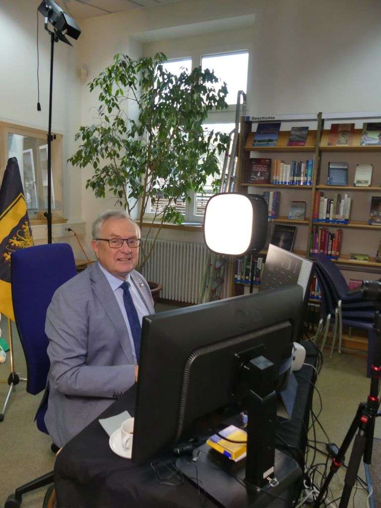 Bu: Leitung der Online-Sitzung aus der Pfalzbibliothek in Kaiserslautern: Bezirkstagsvorsitzender Theo Wieder