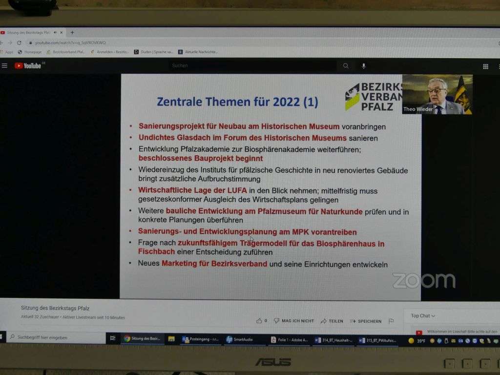 Der Bezirkstag Pfalz hat in seiner gut viereinhalbstündigen Videokonferenz, die per Livestream übertragen wurde, nach eingehender Diskussion einstimmig bei einer Enthaltung den Haushalt 2022 für den Bezirksverband Pfalz verabschiedet. Das Gesamtvolumen beträgt im kommenden Jahr 108,3 Millionen Euro (gegenüber 109,5 Millionen Euro im Vorjahr). „Der Haushalt ist ausgeglichen“, sagte Bezirkstagsvorsitzender Theo Wieder in seiner Etatrede. Dies sei „unabdingbar notwendig“ gewesen, da ansonsten „die Genehmigung des Haushalts stark gefährdet“ sei. Der Etat beinhalte allerdings wegen der Corona-Pandemie „erhebliche Risiken“. Zentrale Themen des kommenden Jahres seien das Voranbringen der Sanierung des Neubaus und des Glasdachs über dem Foyer des Historischen Museums der Pfalz, die bauliche Weiterentwicklung der Pfalzakademie zur Biosphärenakademie, der Wiedereinzug des Instituts für pfälzische Geschichte und Volkskunde, die Betrachtung der wirtschaftlichen Lage der Landwirtschaftlichen Untersuchungs- und Forschungsanstalt (LUFA), das bauliche Voranbringen des Pfalzmuseums für Naturkunde und des Museums Pfalzgalerie und die Entwicklung eines neuen Marketings für den Bezirksverband Pfalz und seine Einrichtungen. Des Weiteren soll die Fortentwicklung des Hofguts Neumühle und der Pfalzbibliothek sowie die Umsetzung eines dreigliedrigen Führungsmodells beim Pfalztheater vorangetrieben, das Modell der umgekehrten Integration am Pfalzinstitut für Hören und Kommunikation gesichert, die neuen Aufgaben in die Organisationsstruktur der Zentralverwaltung aufgenommen und die Denkwerkstätten weitergeführt werden. Schließlich gehe es um die konsequente Bekämpfung der Pandemie.