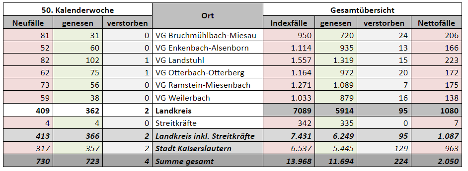 KL – Coronavirus Stadt/Kreis: 13.968 Indexfälle in Stadt und Landkreis, 11.694 genesenen Personen, 224 Todesfälle, KW 50.