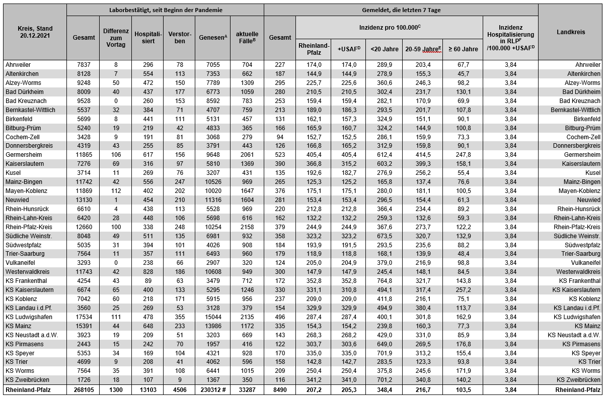 Coronavirus SARS-CoV-2: Fallzahlen für Rheinland-Pfalz, (Datenstand vom 20.12.2021, 14:10 Uhr)