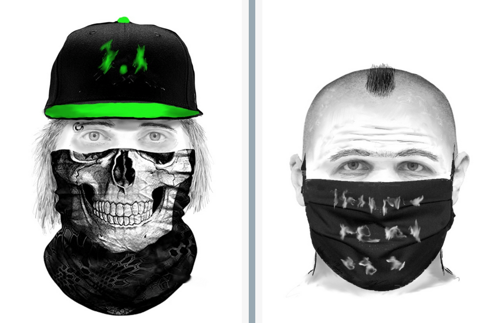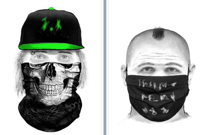 Täter 2: Der Mann ist etwa 1,70 bis 1,75 Meter groß und schlank. Er könnte zwischen 22 und 30 Jahre alt sein. Er trug längere Haare, die augenscheinlich blondiert waren. Auffällig war ein silbernes Piercing in der linken Augenbraue. Der Unbekannte sprach Pirmasenser Dialekt. Er trug unter anderem ein Schlauchschal auf den der Kiefer eines Totenkopfs aufgedruckt war.