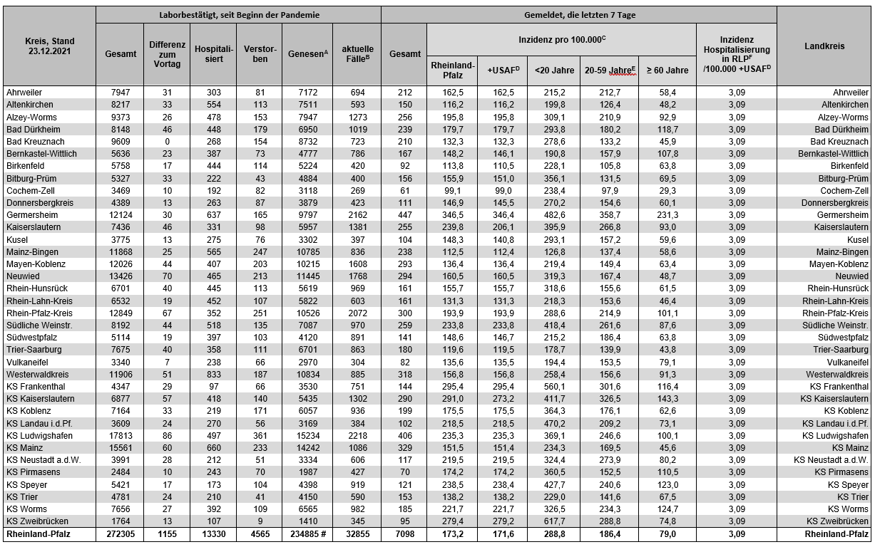 Coronavirus SARS-CoV-2: Fallzahlen für Rheinland-Pfalz, Datenstand vom 23.12.2021, 14:10 Uhr)