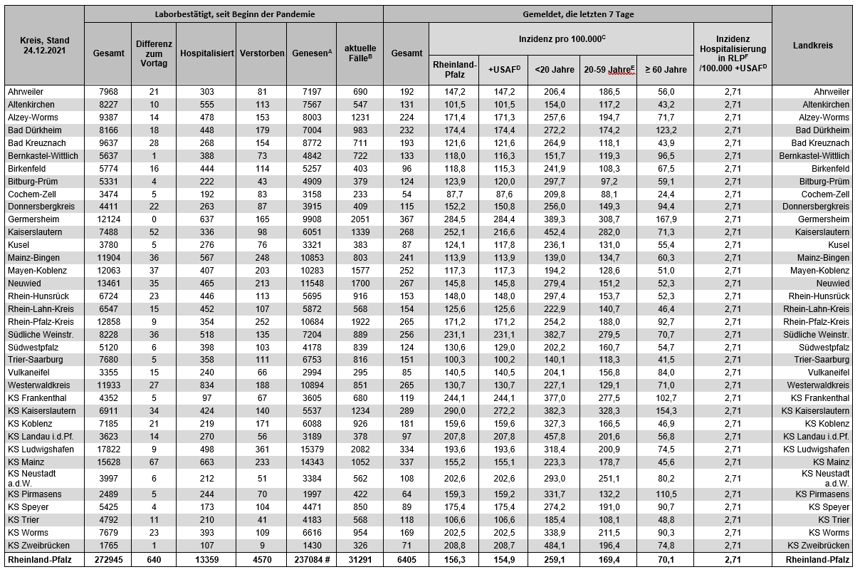 Coronavirus SARS-CoV-2: Fallzahlen für Rheinland-Pfalz, (Datenstand vom 24.12.2021, 11:10 Uhr)