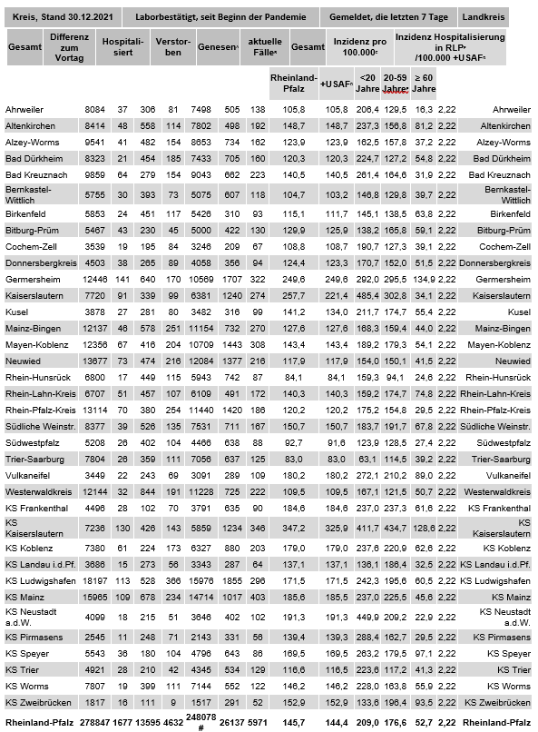 Coronavirus SARS-CoV-2: Fallzahlen für Rheinland-Pfalz, (Datenstand vom 30.12.2021, 14:10 Uhr)
