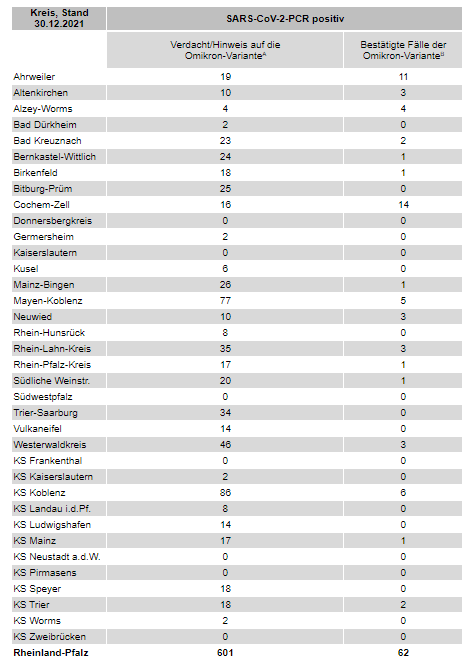 HINWEIS: Die Meldung enthält heute eine Übersicht der Omikron-Fälle in Rheinland-Pfalz. Wir berichten künftig über Verdachtsfälle und bestätigte Fälle der Omikron-Virusvariante, die dem LUA von den rheinland-pfälzischen Gesundheitsämtern bis zum Berichtszeitpunkt übermittelt wurden. Diese Übersicht gibt es jeweils an Werktagen von Montag bis Freitag.