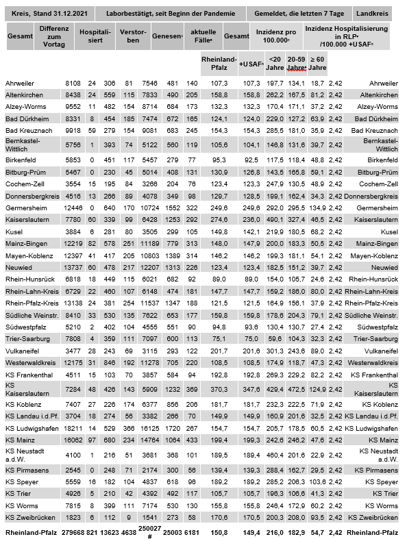 Coronavirus SARS-CoV-2: Fallzahlen für Rheinland-Pfalz, (Datenstand vom 31.12.2021, 11:10 Uhr)