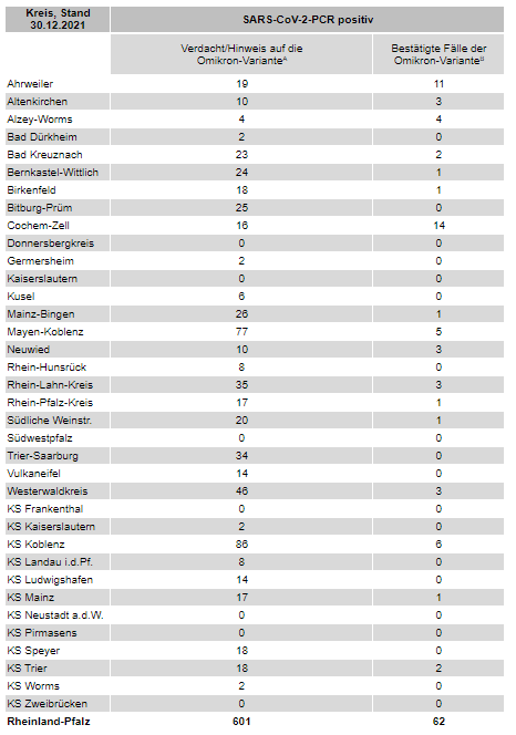 HINWEIS: Die Meldung enthält heute eine Übersicht der Omikron-Fälle in Rheinland-Pfalz. Wir berichten künftig über Verdachtsfälle und bestätigte Fälle der Omikron-Virusvariante, die dem LUA von den rheinland-pfälzischen Gesundheitsämtern bis zum Berichtszeitpunkt übermittelt wurden. Diese Übersicht gibt es jeweils an Werktagen von Montag bis Freitag.