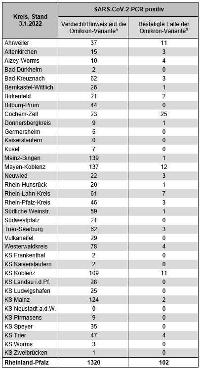 HINWEIS: Die Meldung enthält heute eine Übersicht der Omikron-Fälle in Rheinland-Pfalz. Wir berichten künftig über Verdachtsfälle und bestätigte Fälle der Omikron-Virusvariante, die dem LUA von den rheinland-pfälzischen Gesundheitsämtern bis zum Berichtszeitpunkt übermittelt wurden. Diese Übersicht gibt es jeweils an Werktagen von Montag bis Freitag.