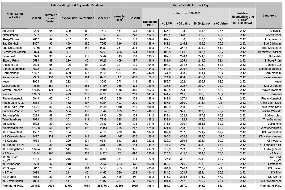 Coronavirus SARS-CoV-2: Fallzahlen für Rheinland-Pfalz, (Datenstand vom 04.01.2022, 14:10 Uhr)