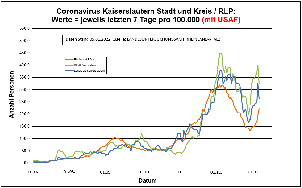 Coronavirus KL letzten 7 Tage pro 100.000 (mit USAF): Landkreis 263,5 ; Stadt 325,3 ; RLP 221,2