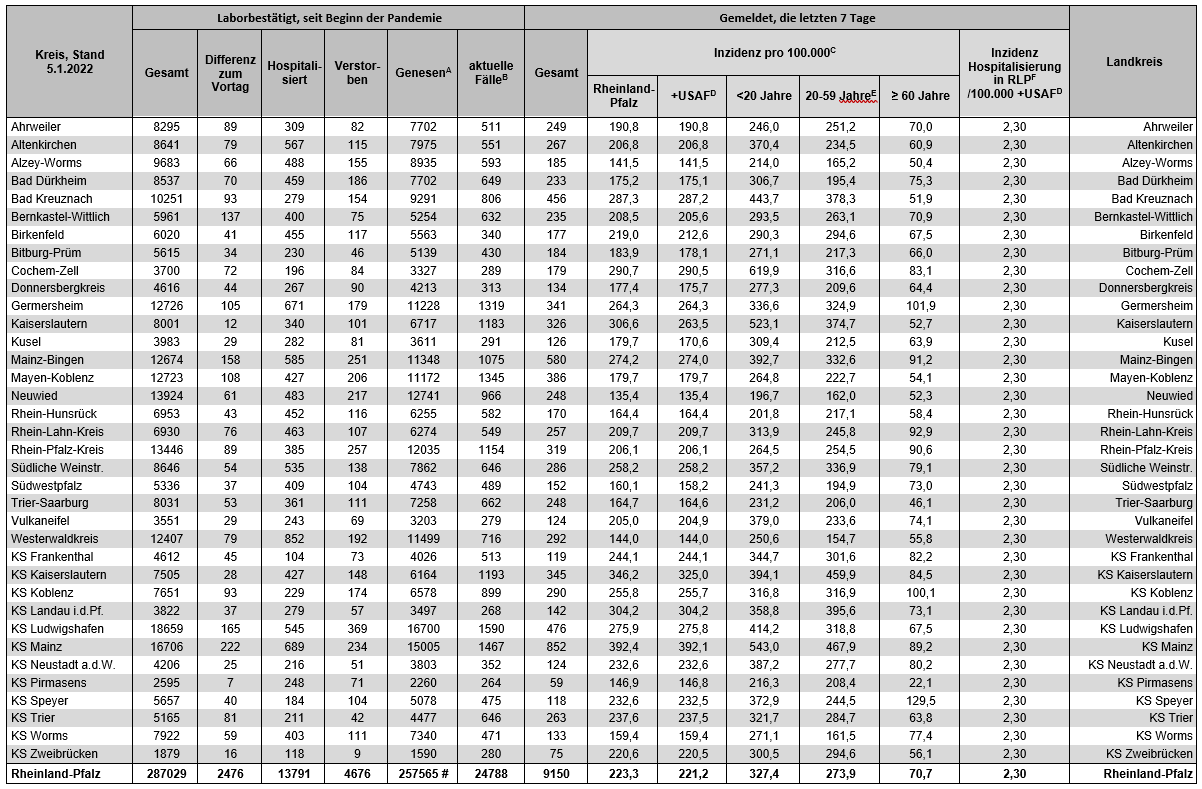 Coronavirus SARS-CoV-2: Fallzahlen für Rheinland-Pfalz, (Datenstand vom 05.01.2022, 14:10 Uhr)