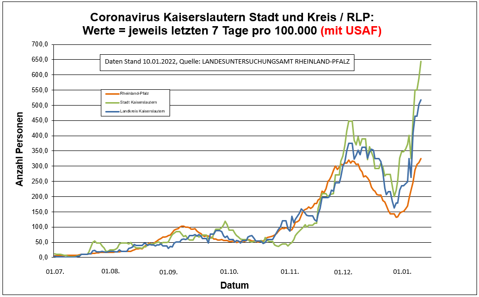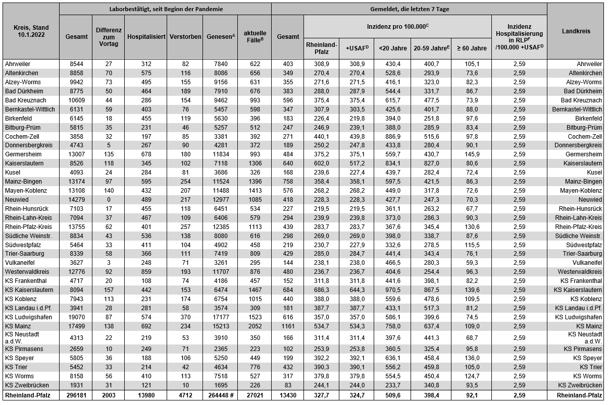 Coronavirus SARS-CoV-2: Fallzahlen für Rheinland-Pfalz, (Datenstand vom 10.01.2022, 14:10 Uhr)