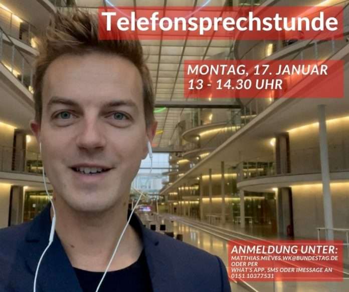 Der Bundestagsabgeordnete, Matthias Mieves, bietet am Montag, 17. Januar von 13 bis 14:30 Uhr eine telefonische Sprechstunde für alle Bürgerinnen und Bürger in seinem Wahlkreis an. Alle Interessierten können sich gerne anmelden per E-Mail an matthias.mieves.wk@bundestag.de oder per What’s App, SMS oder iMessage an 0151 10377531. Sie werden dann in der Sprechstunde von Matthias Mieves persönlich angerufen.