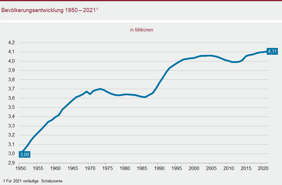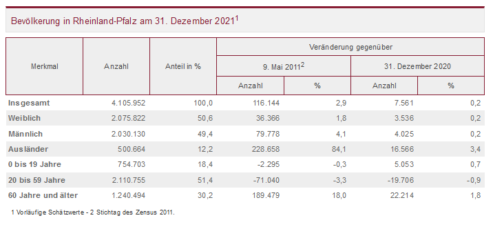 Am Jahresende 2021 lebten in Rheinland-Pfalz rund 4.105.000 Menschen. Dies ist die höchste Zahl in der fast 75-jährigen Landesgeschichte. Nach einer vorläufigen Schätzung des Statistischen Landesamtes stieg die Einwohnerzahl damit zum zehnten Mal in Folge. Der Bevölkerungszuwachs fiel mit annähernd 7.600 Personen etwas höher aus als im Jahr 2020.