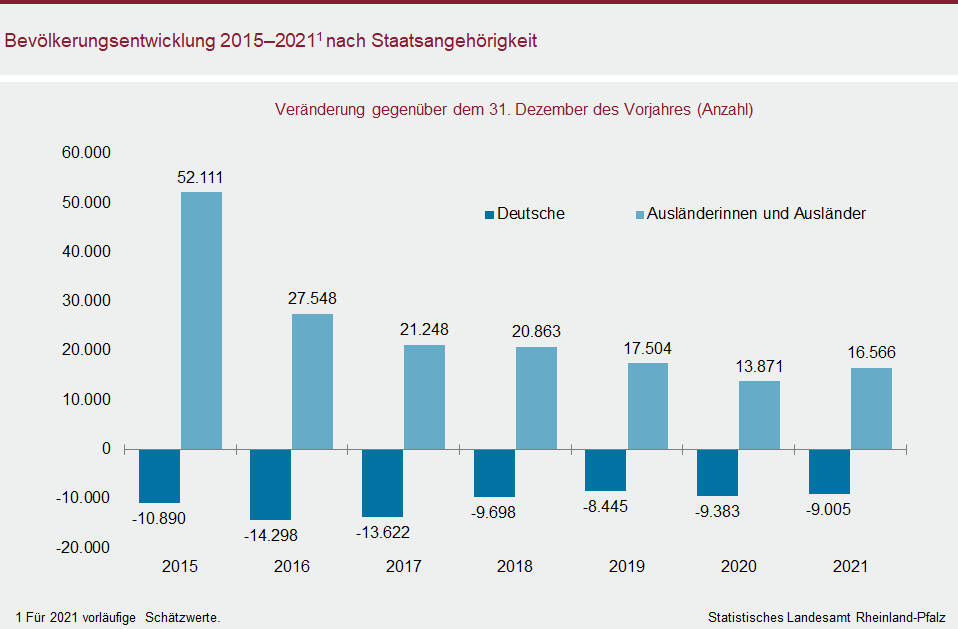 Wie in den Jahren zuvor geht der Anstieg auf die räumliche Bevölkerungsbewegung zurück; das heißt, es zogen deutlich mehr Menschen nach Rheinland-Pfalz zu als das Land verließen. Dieser Wanderungsüberschuss belief sich auf schätzungsweise rund 19.400. Die natürliche Bevölkerungsbewegung weist – sicherlich auch aufgrund der Auswirkungen der Corona-Pandemie – erneut ein deutliches Defizit aus. Die Zahl der im gesamten Jahresverlauf Gestorbenen dürfte mit schätzungsweise mehr als 50.300 um rund 11.800 über der Zahl der Geborenen von rund 38.500 gelegen haben.
